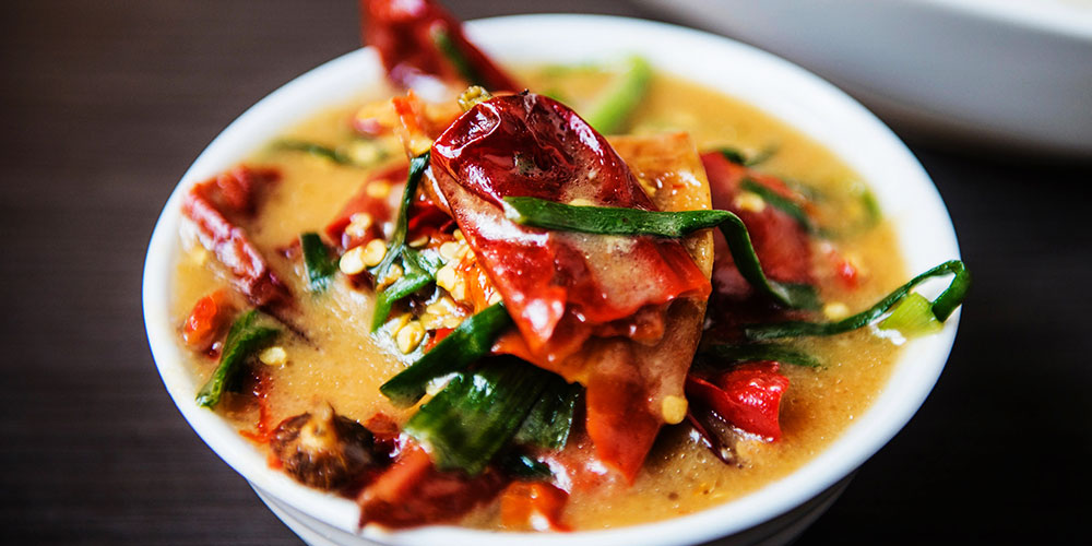 This dish is a spicy pork stew made with radishes and dried red chillies.