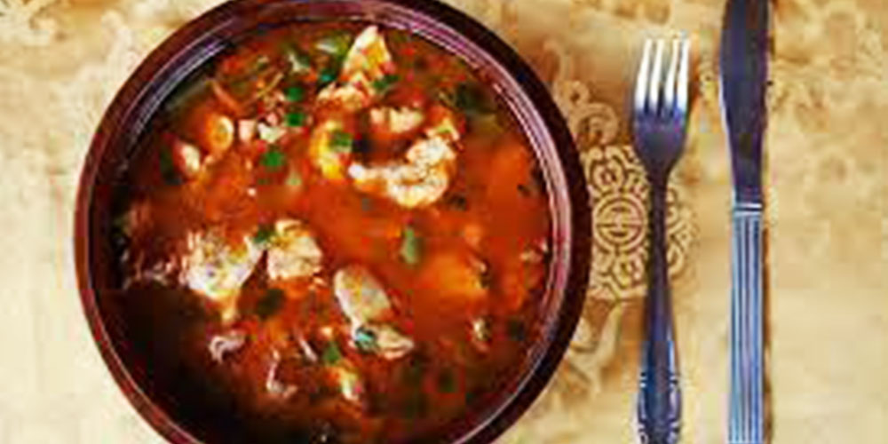 Spicy chicken stew with tomatoes, onions, and green chillies. Served with red rice.