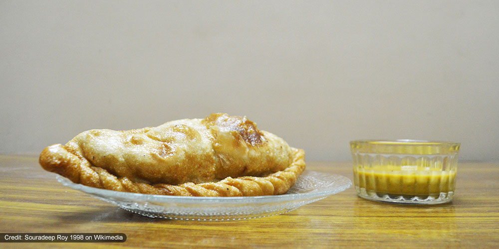 A Tibetan dish which includes fried bread stuffed with a mixture of seasoned meat and vegetables served with green and red chutney.